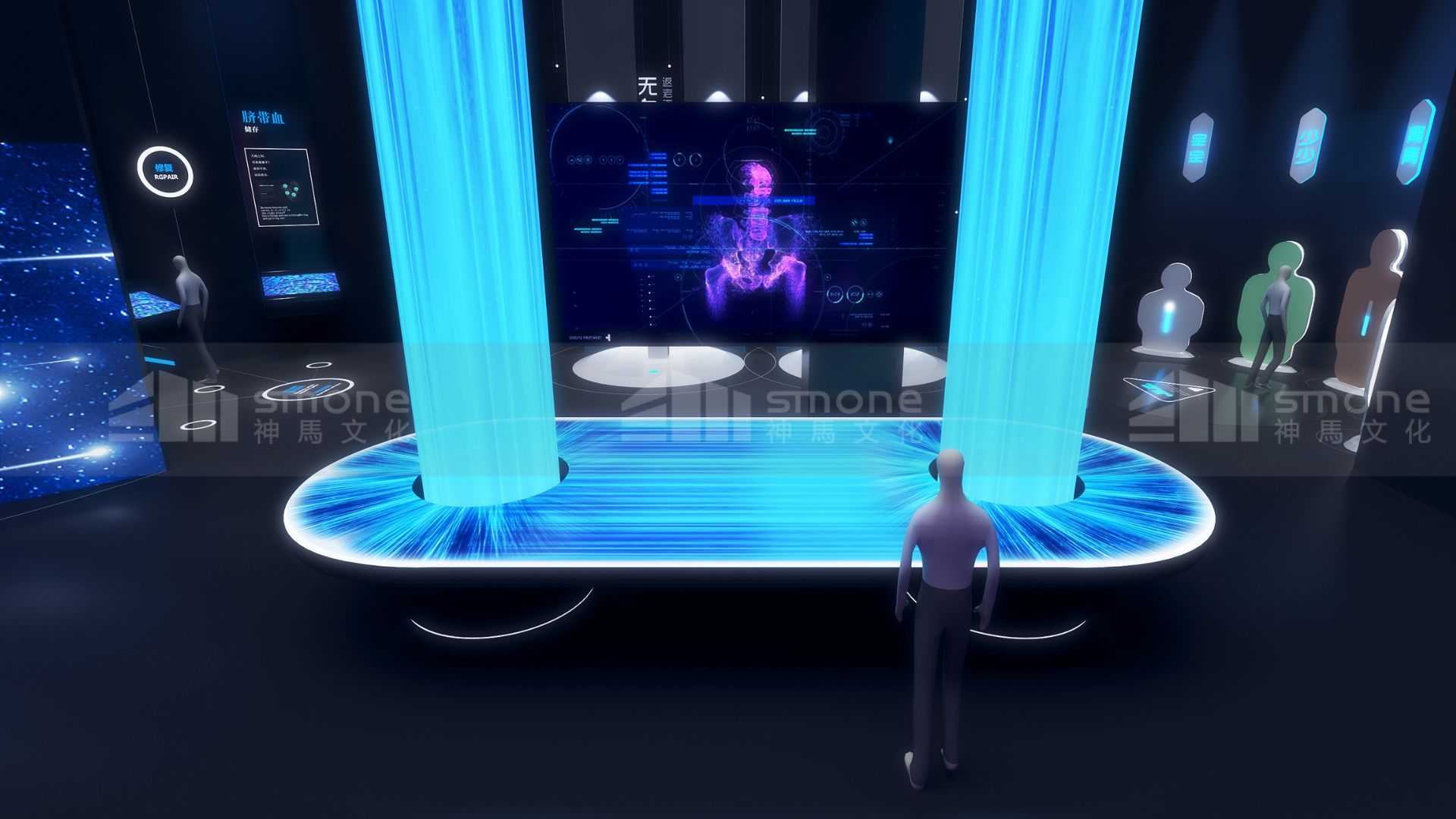 环绕四周的智能感应展板,能依据参观者的靠近自动点亮并播放定制化科普视频,内容从晦涩的科研成果到贴近生活的干细胞美容、疾病治疗案例一应俱全,精准满足不同知识层次人群的探索欲。